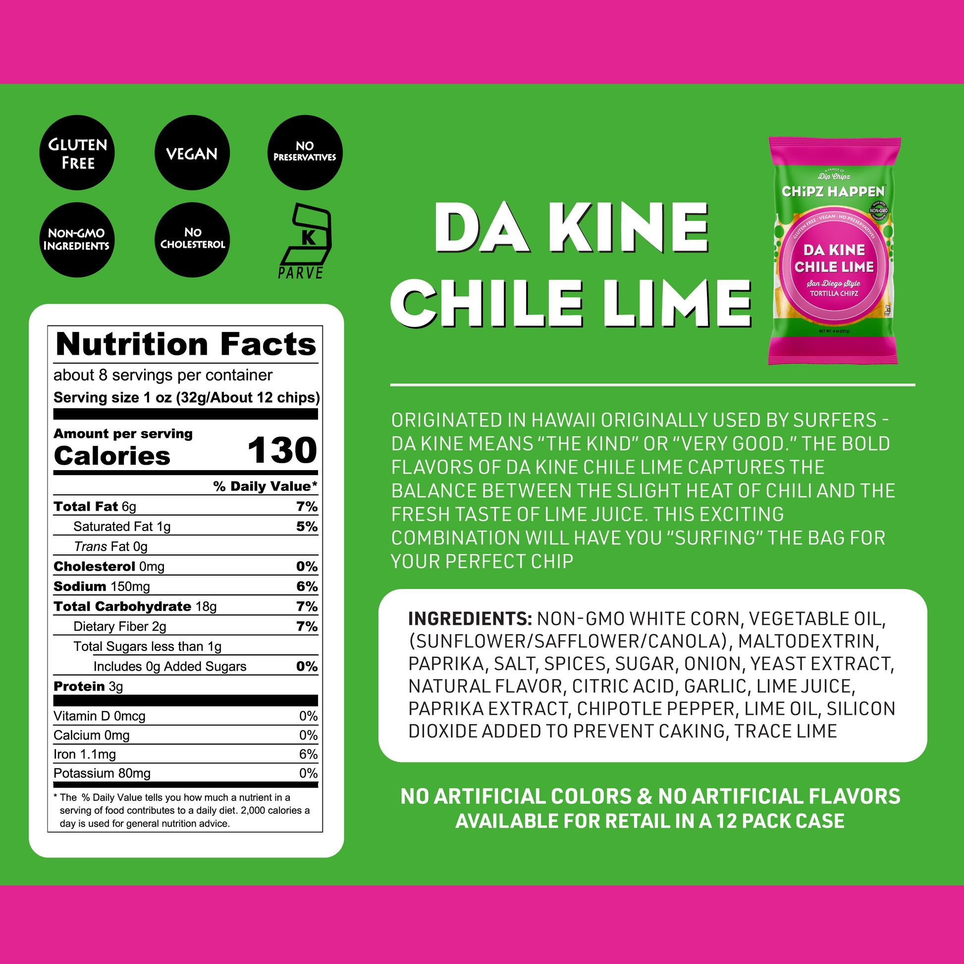 Originated in Hawaii originally used by surfers - Da Kine means: "The Kind" or "Very Good." The bold flavors of Da Kine Chile Lime captures the balance between the slight heat of the chile and the fresh taste of squeezed lime juice. This exciting combination will have you "surfing" the bag for the perfect chip.